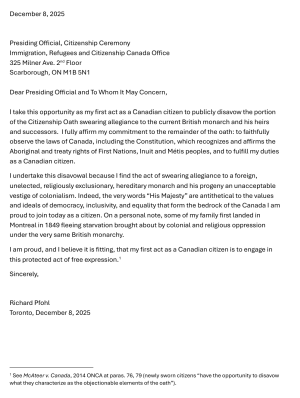 I undertake this disavowal because I find the act of swearing allegiance to a foreign, unelected, religiously exclusionary, hereditary monarch and his progeny an unacceptable vestige of colonialism. Indeed, the very words "His Majesty" are antithetical to the values and ideals of democracy, inclusivity, and equality that form the bedrock of the Canada I am proud to join today as a citizen. On a personal note, some of my family first landed in Montreal in 1849 fleeing starvation brought about by colonial and religious oppression under the very same British monarchy. I am proud, and I believe it is fitting, that my first act as a Canadian citizen is to engage in this protected act of free expression. Read Richard's full letter to the presiding official in his citizenship ceremony. |