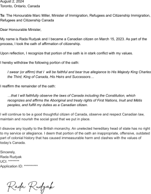 I wholeheartedly renounce and object to this segment connected to the British monarchy, which I was legally obligated to take earlier today for Canadian citizenship. I deem it inappropriate, profoundly offensive, and a vestige of our colonial history. Earlier this year, prior to the coronation of King Charles III, the Archbishop of Canterbury in England emphasized on several occasions that the allegiance pledge to the monarch is an invitation, not a mandatory command. Even the very individual who conducted the coronation and crowned our symbolic King of Canada affirmed its optional nature. Read Dimitri's full letter to the Citizenship Judge Joan Mahoney and to The Honourable Marc Miller, Minister of Immigration, Refugees and Citizenship. |